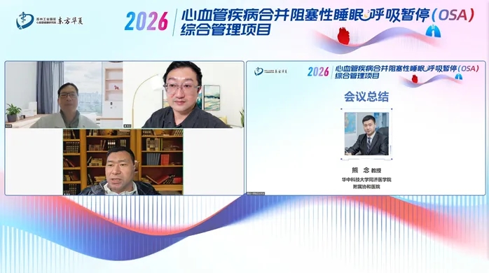 为进一步加强我国心血管疾病防治体系建设,实现中国心血管疾病预防与康复事业规范可持续发展,由苏州工业园区东方华夏心血管健康研究院发起的《心血管疾病合并阻塞性睡眠呼吸暂停(OSA)综合管理项目(第二期)》于2026年1月22日在线上成功举办。本期会议邀请心血管内科、神经内科及耳鼻咽喉头颈外科领域多位权威专家齐聚云端,以加强OSA综合防控为抓手,为我国心血管疾病高效防控,精准施治贡献力量。