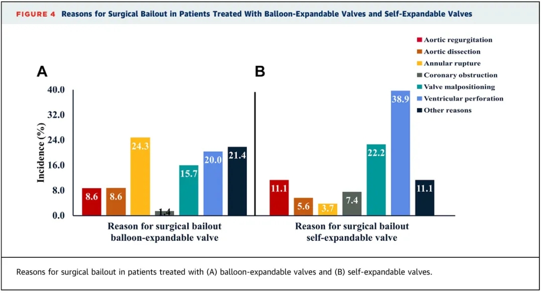据研究结果显示,在2007-2022年的15年间,24,010名接受经股动脉TAVR的患者中,应用新一代瓣膜(2013 年后商业化瓣膜,例如增加可回收功能的新一代自膨瓣)使转外科治疗发生率从0.67%降低至0.33%。在应用球扩瓣亚组中,术中发生瓣环撕裂(24.3%)导致的转外科治疗占比最高,且远高于自膨瓣组(24.3% vs 3.7%)。发生转外科治疗的患者术后30天死亡率为51.7%,1年内死亡率为68.3%,且明显高于未发生转外科治疗的患者。