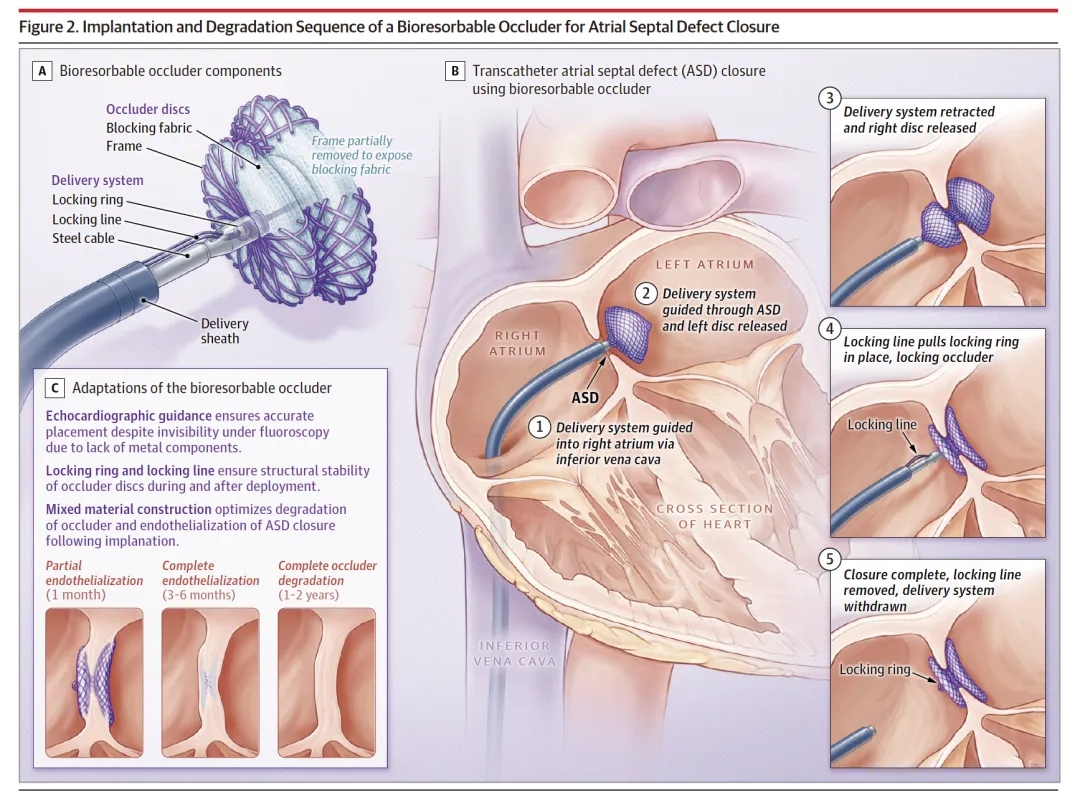 这项题为“Bioresorbable versus Metallic Occluders for Transcatheter Atrial Septal Defects Closure:A Randomized Clinical Trial”的多中心随机对照研究,共纳入10家心脏中心,230例房间隔缺损患者,按1:1比例随机分配接受生物可降解封堵器(116例)或金属封堵器(114例)。术后6个月,生物可降解封堵器在房间隔缺损封堵中不劣于金属封堵器,两组房间隔缺损封堵成功率几乎相同。术后2年,生物可降解封堵器接近完全降解(99.8%),且植入生物可吸收封堵器的患者心电图异常发生率更低,二尖瓣反流程度更轻。研究意味着可降解封堵器在长期安全性上展现出独特优势——当金属封堵器仍在患者体内存留时,中国器械已“功成身退”,留下一个自体组织修复的房间隔。