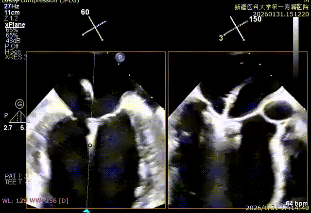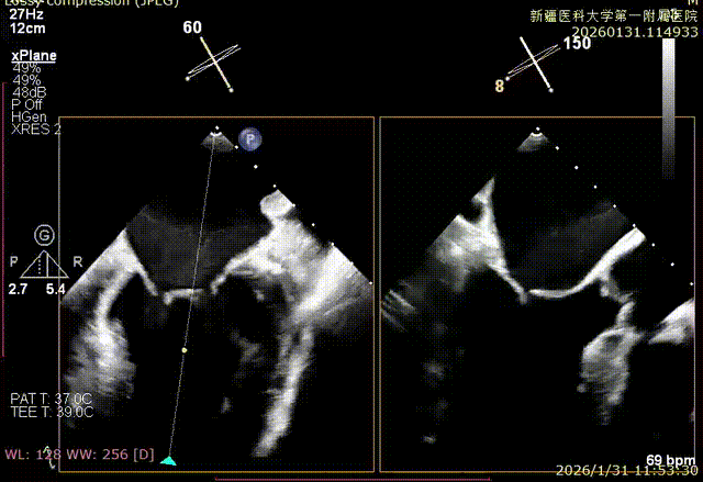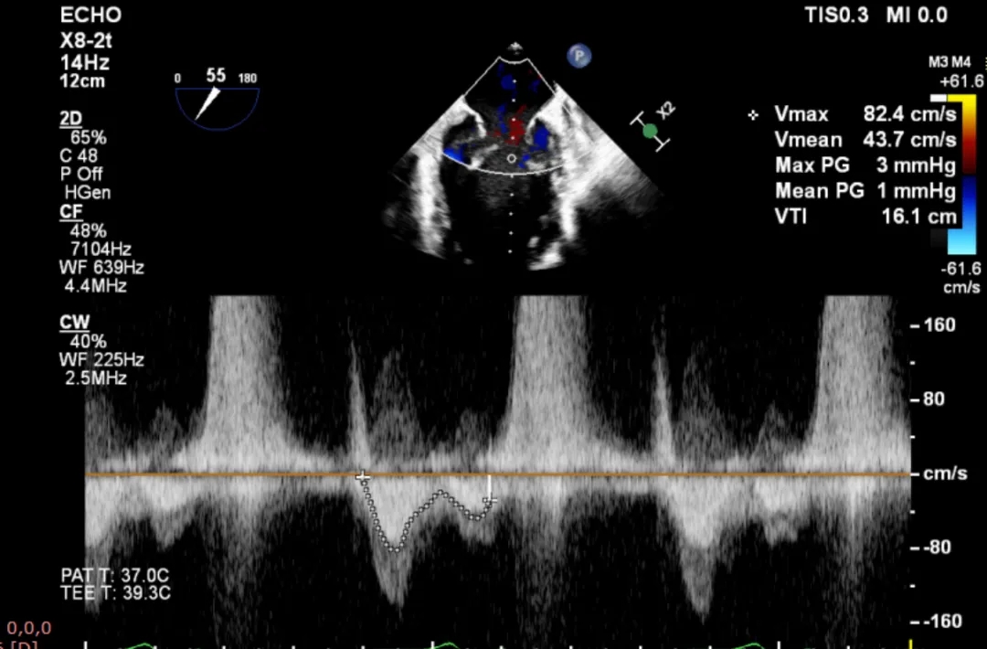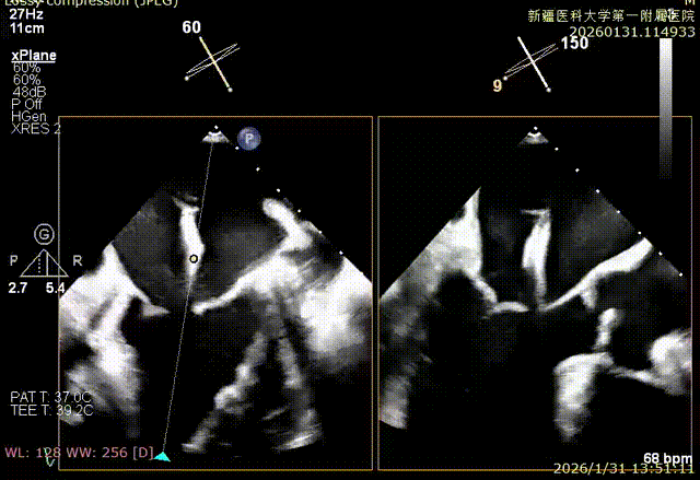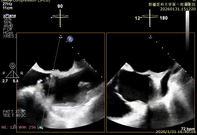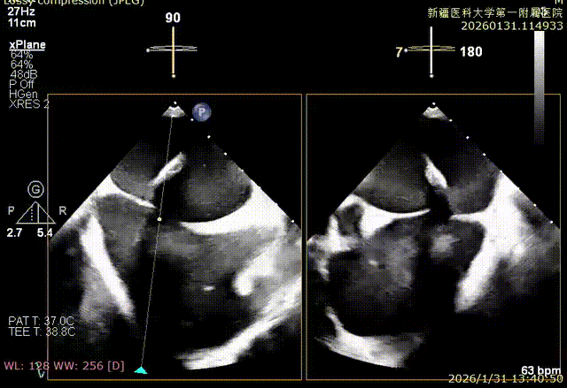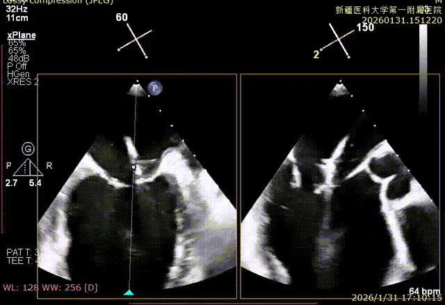 该例患者为VFMR,病变位于2区,反流为中心性反流。术前制定手术策略:使用1把XTR解决患者二尖瓣反流。术中首先进行房间隔穿刺,最终穿刺高度4.2cm。穿刺成功后将SGC和XTR-CDS依次送入左心房,通过操控“M”旋钮调节SGC,使二尖瓣夹避开华法林脊并成功定位于2区正上方。在2区进行弹道测试成功后,进行Orientation调整。最终在2区将二尖瓣夹送入左心室,成功捕捞和夹持瓣叶后缓慢关紧夹臂。TEE检查见二尖瓣反流程度降低至微量,二尖瓣双孔组织桥稳定,跨瓣压差1mmHg,肺静脉逆流改善明显,手术安全结束。