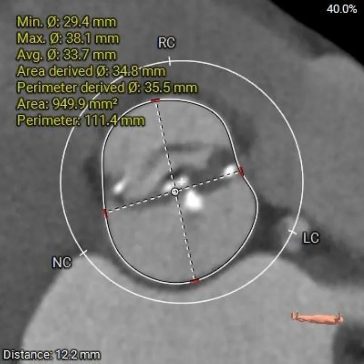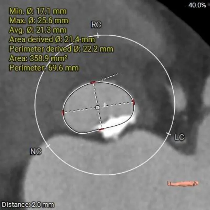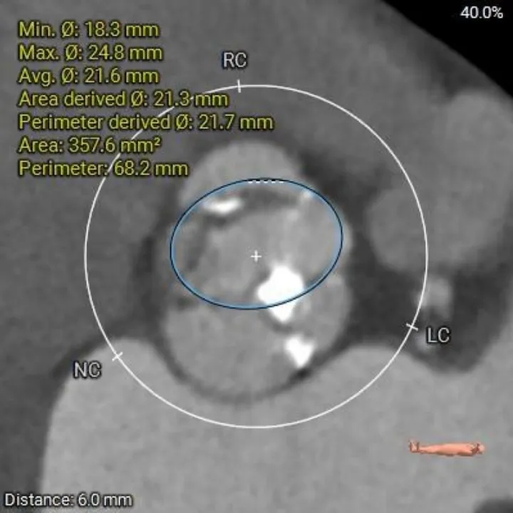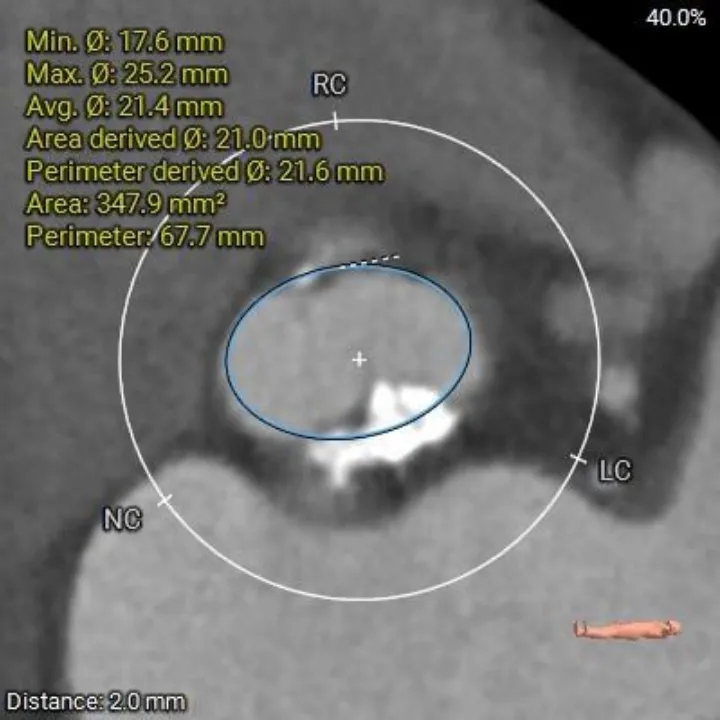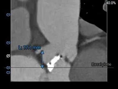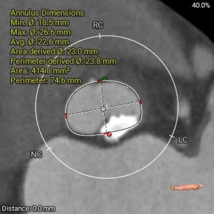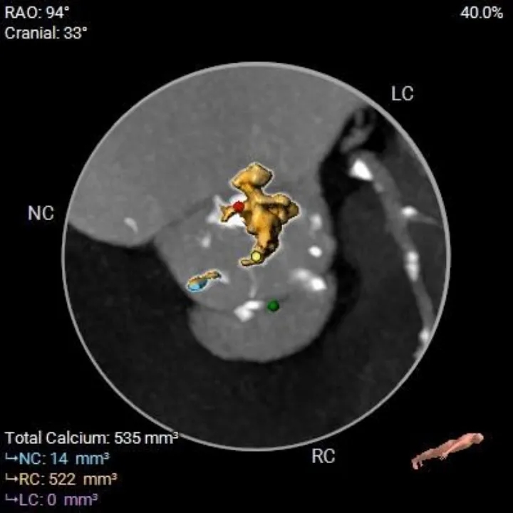 1、复杂根部解剖:患者为Type 0型二叶瓣,且伴有重度钙化。这种解剖结构常导致瓣膜展开不对称、锚定困难,并增加术后瓣周漏的风险。