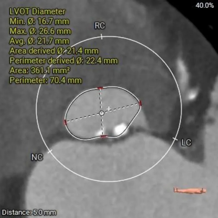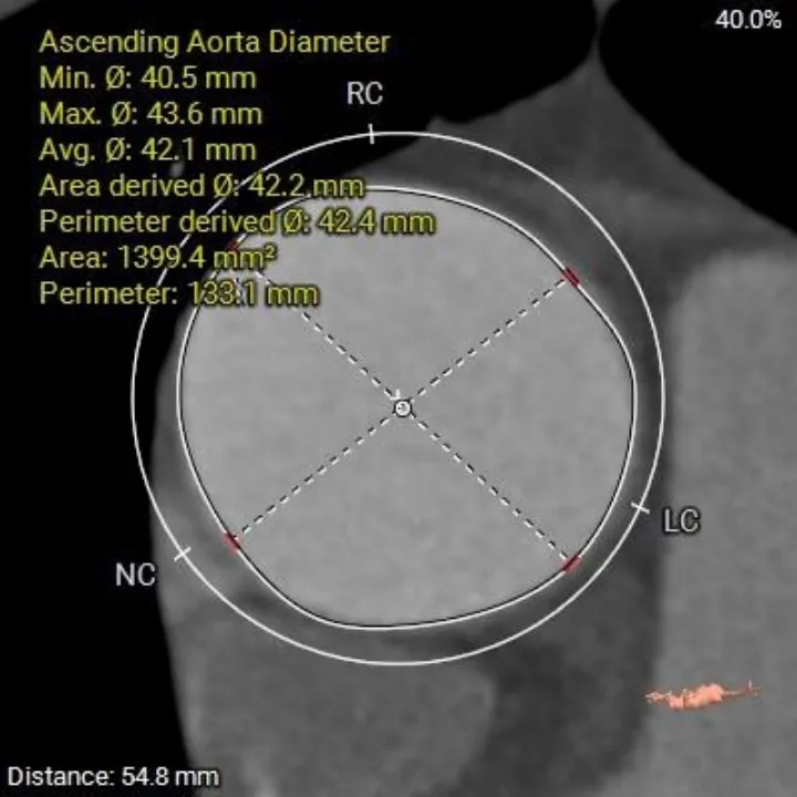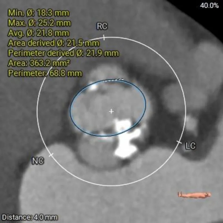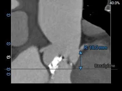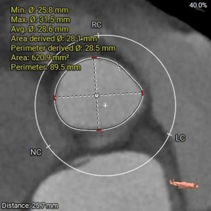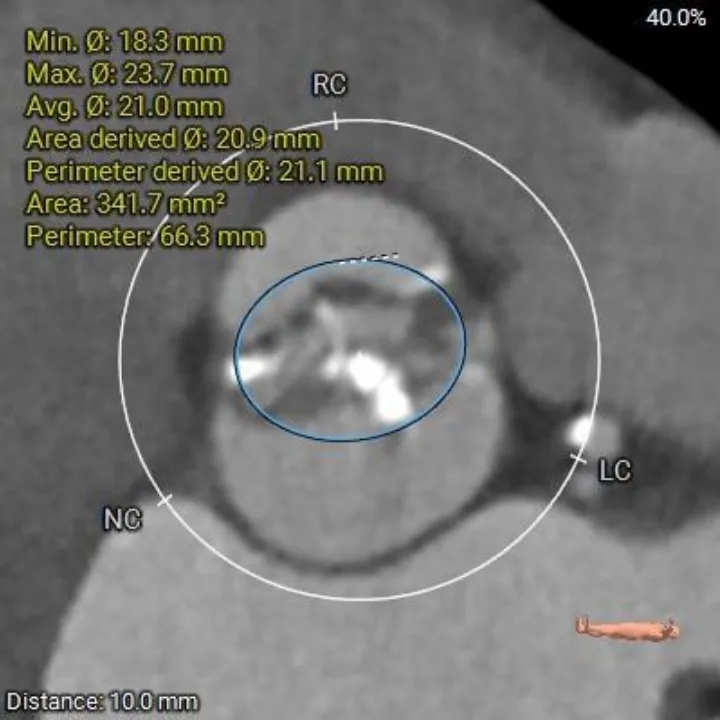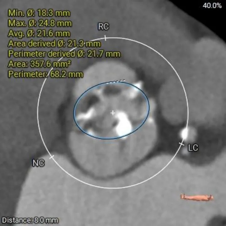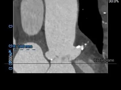 1、复杂根部解剖:患者为Type 0型二叶瓣,且伴有重度钙化。这种解剖结构常导致瓣膜展开不对称、锚定困难,并增加术后瓣周漏的风险。