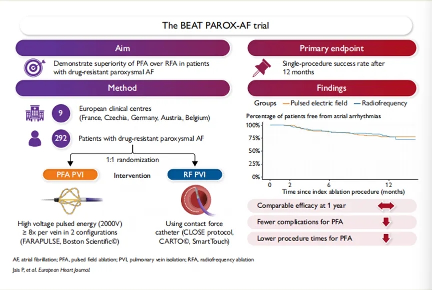 文献来源:Jais P, Neuzil P, Scherr D, Frison E, Knecht S, Boveda S, Deisenhofer I, Maury P, Deneke T, Cochet H, Rousset M, Renaudeau V, Sauer E, Sermesant M, Kautzner J, Erhard N, Wichterle D. Pulsed field vs radiofrequency ablation for paroxysmal atrial fibrillation: the BEAT PAROX-AF trial. Eur Heart J. 2026 Jan 22:ehaf1115. doi: 10.1093/eurheartj/ehaf1115. Epub ahead of print. PMID: 41568658.