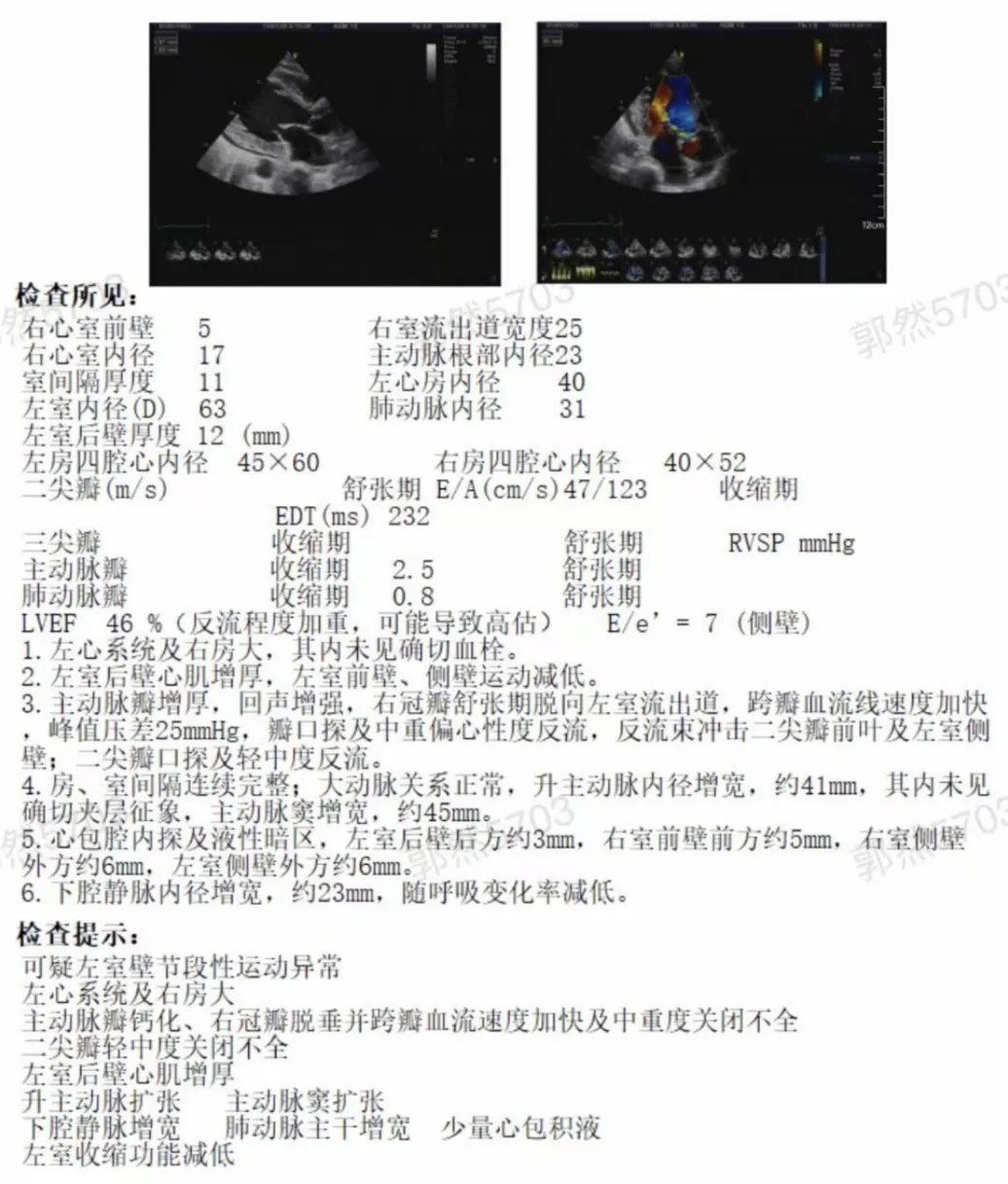 LVEF 46%(反流程度加重,可能导致高估)。