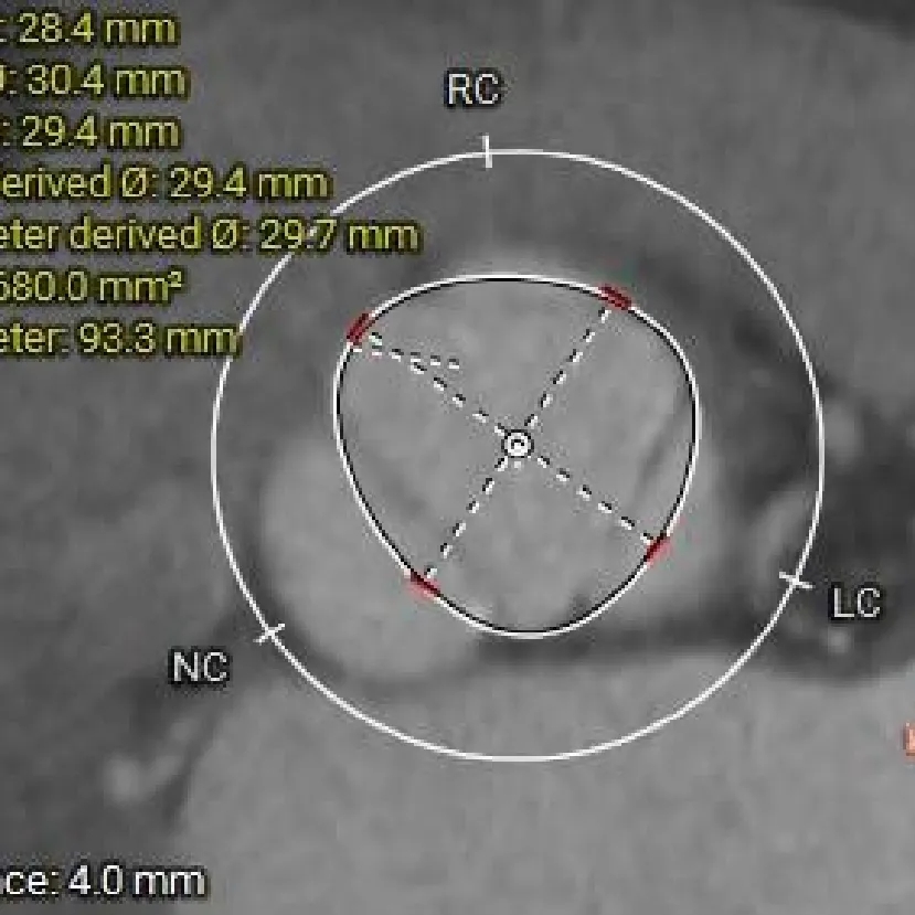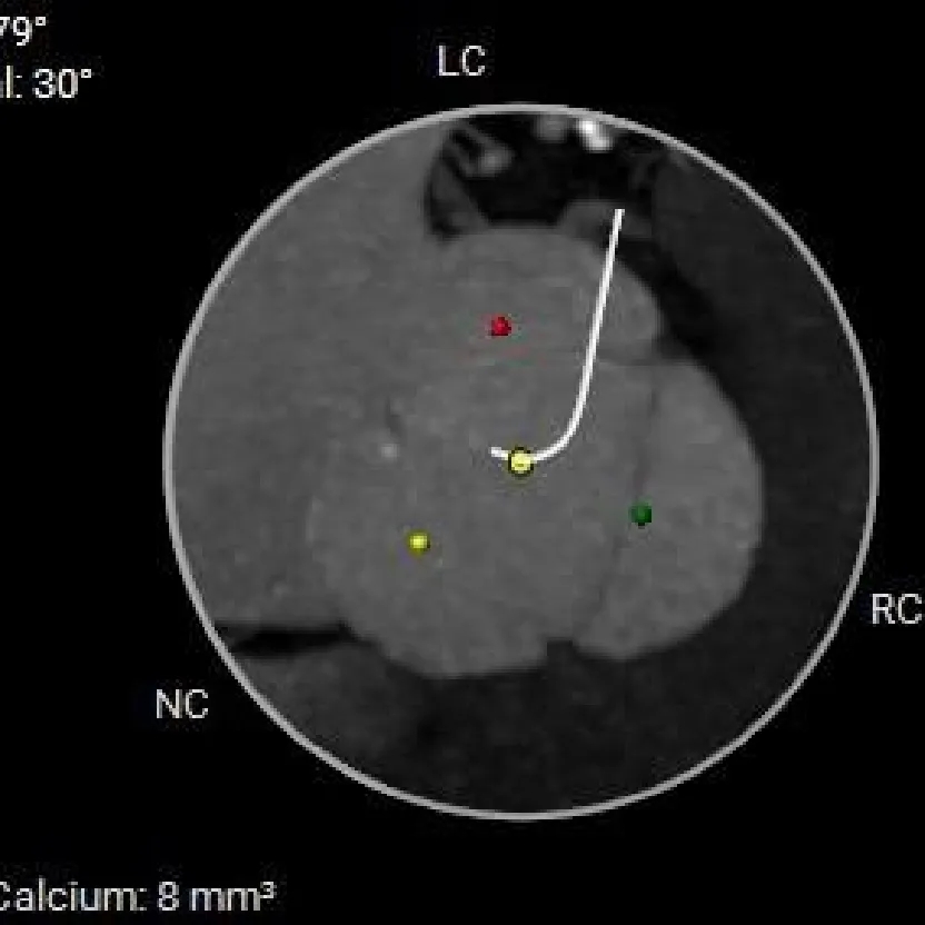 本例患者病情复杂,存在瓣环内径偏大、右冠瓣叶脱垂、血管入路条件差及左心扩大等多重因素。经郭然教授团队组织多学科综合评估后,最终确定以经导管主动脉瓣置换术(TAVR)为核心治疗方案。针对纯反流病例中瓣膜定位与锚定的技术挑战,团队创新性应用了具备“全释放/全回收”功能的国产新一代瓣膜系统ScienCrown。该器械的全回收功能为手术操作提供了重要保障,使术者能够从容进行精细调整,从而有效确保手术的安全性与成功率。