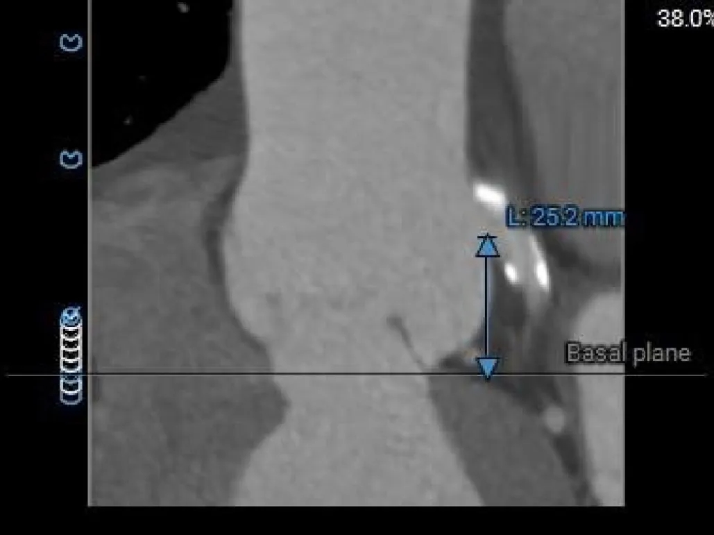 左侧下肢动脉入路最小平均内径5.4mm,右侧下肢动脉入路最小平均内径6.2mm,右侧穿刺点附近存在连续性钙化。