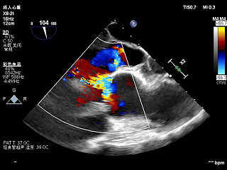 主动脉瓣增厚,回声增强,右冠瓣舒张期脱向左室流出道,跨瓣血流线速度加快,峰值压差25mmHg,瓣口探及中重度偏心性反流,反流束冲击二尖瓣前叶及左室侧壁;二尖瓣口探及轻中度反流。