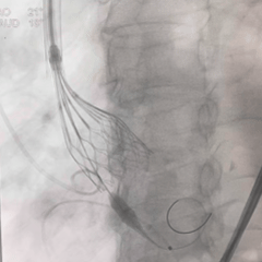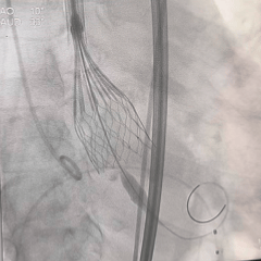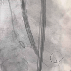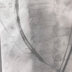 入路选择:右侧股动脉为主入路,外科切开方式植入大鞘,必要时对入路血管进行球囊扩张。