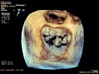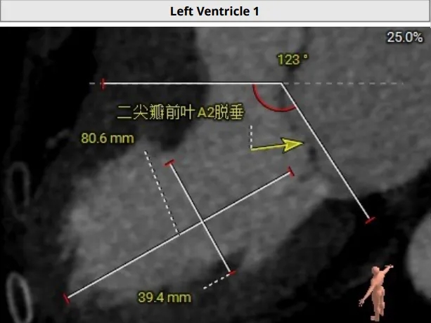 经胸超声报告提示:患者二尖瓣2区及3区前叶关闭时脱入左房,二尖瓣重度反流(MR 4+),患者LA前后径约52mm,LVEDD约68mm,LVESD约42mm,EF值:65%,经胸超声测二尖瓣瓣口面积约6.1cm2,主动脉瓣无冠瓣脱垂并中重度反流,三尖瓣中度反流,估测中度肺动脉高压。