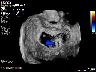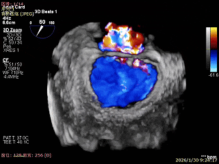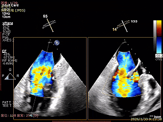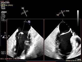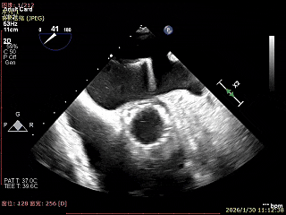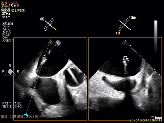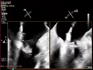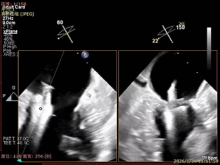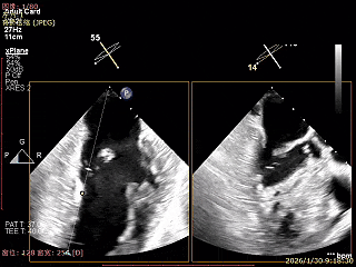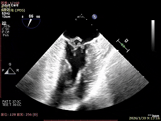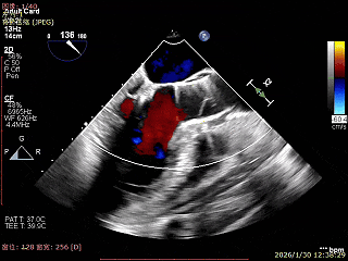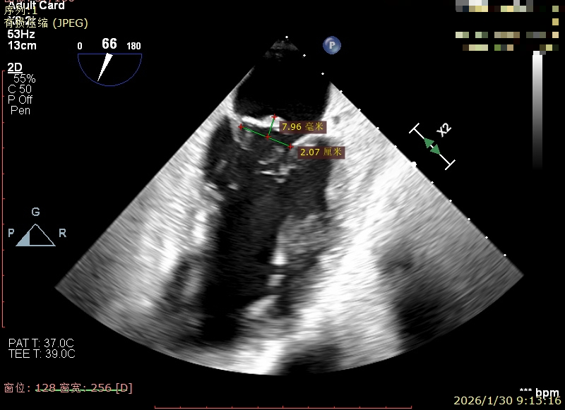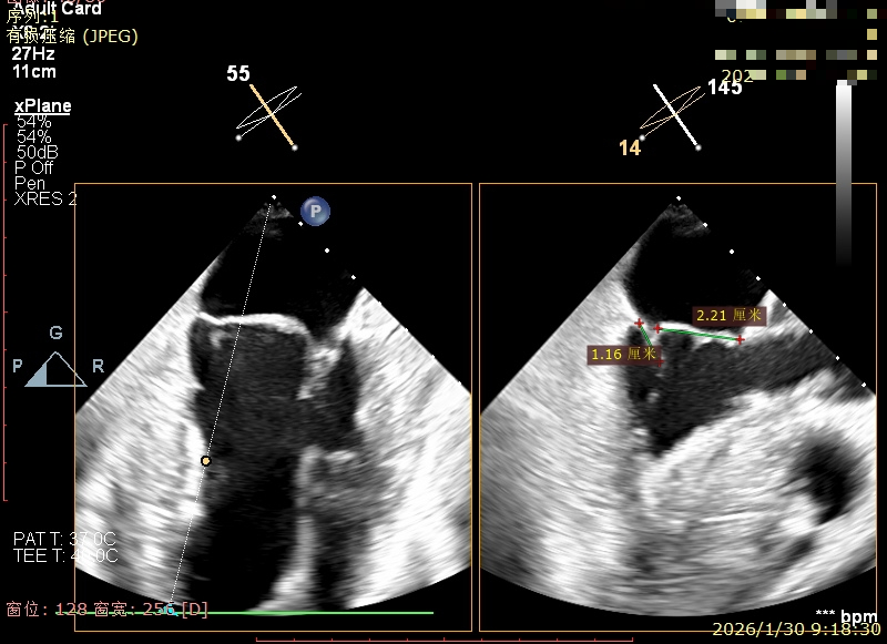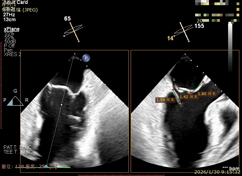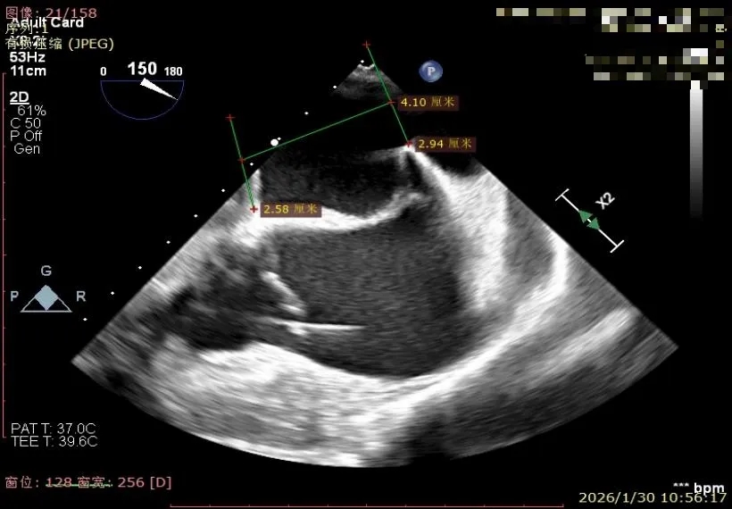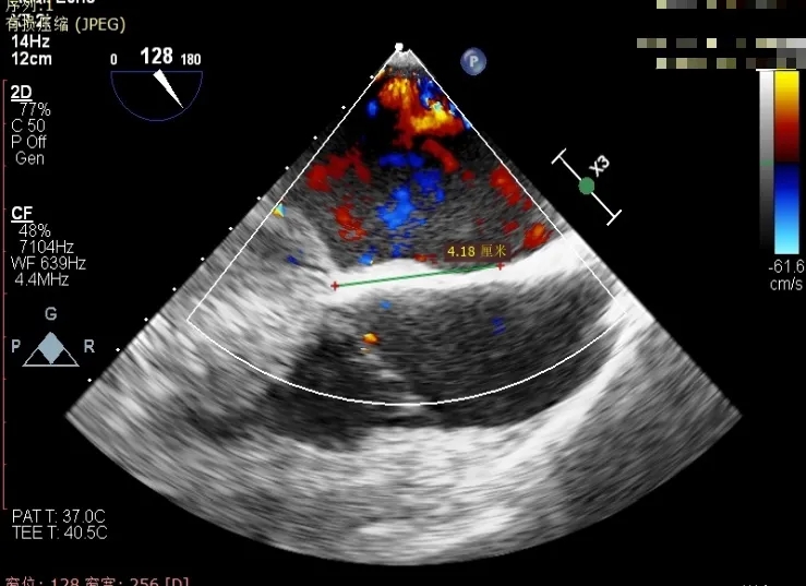经食道超声精细化测量:肺静脉逆流,房间隔可穿刺高度约4.2cm,Flail宽度约21mm,Flail高度约8mm,Flail Gap约4mm, 3区AML长约23mm、PML长约12mm、2区AML约32.2mm,PML约16mm。