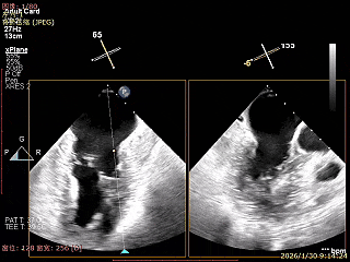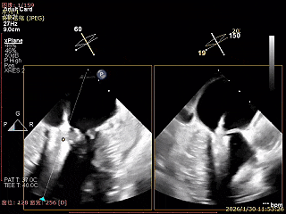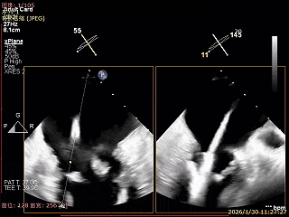 建立右侧股静脉入路,在食道超声引导下进行房间隔穿刺,获得穿刺高度4.1cm,交换Super Stiff超硬导丝至左上肺静脉,使用血管鞘扩张股静脉后,沿超硬导丝送入可操控导引导管(SGC)至左房,将第一枚二尖瓣夹输送系统(CDS-XTR)送入左心房。送入夹子过程中为避免碰到左房组织完成Straddle“骑跨”,顺利完成Straddle并将夹子打弯至二尖瓣环水平。接下来为避免发生缠绕在1区进行轨迹测试,使夹子的运动轨迹指向心尖。在心房侧打开夹臂,调整夹臂方向指向12点-6点方位,与二尖瓣对合缘垂直。完成调整后将夹子移动至3区位置,将二尖瓣夹关紧后缓慢送入左心室。在左室打开夹子重新确认Orientation。准确成功捕捞3区前叶脱垂及反流区域,确认瓣叶瓣尖稳定插入夹臂后,Gripper Down,观察到明显Bouncing后,关紧夹臂予以夹合,夹子内侧反流消失,夹子外侧还有残余脱垂及中量反流。考虑瓣叶长度11mm以上,瓣口面积足够,决定在外侧Side by Side再植入一枚XTR,植入两枚XTR后活动稳固,反流降至Trace。术后肺静脉逆流消失,二尖瓣平均跨瓣压差2mmHg。