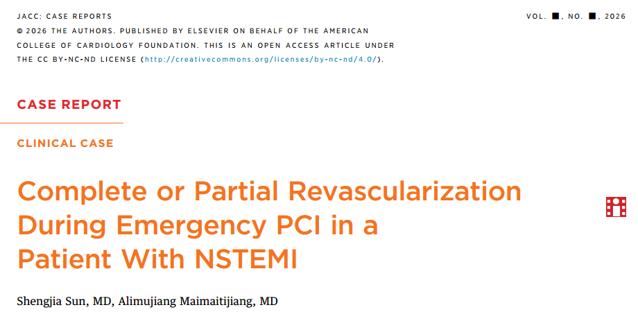 文献来源:Sun S,Maimaitijiang A.Complete or Partial Revascularization During Emergency PCI in a Patient With NSTEMI.JACC Case Rep.2026 Jan 30:106792.