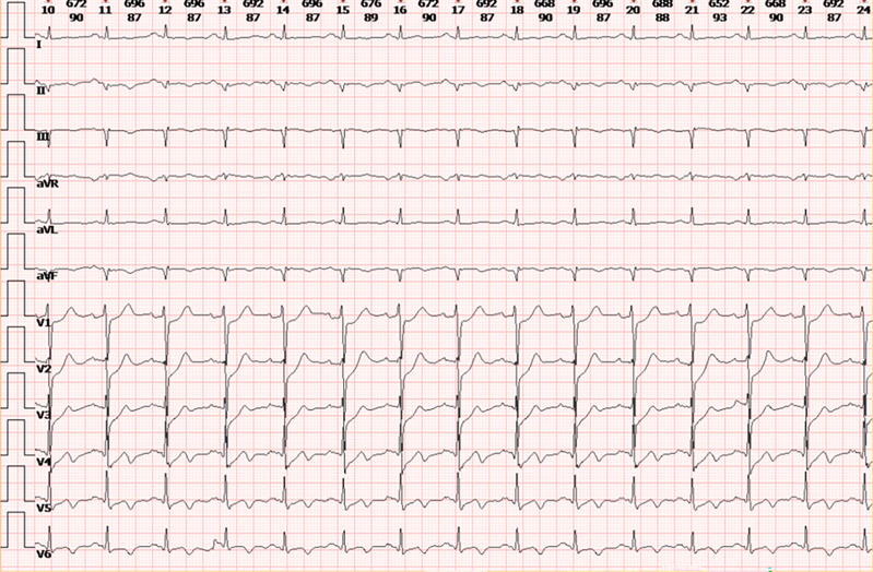 周日上午患者胸痛再发,舌下含服硝酸甘油未缓解,心电图显示V3至V6导联ST段轻度抬高,T波倒置,I、aVL导联R波振幅降低(图2),进行急诊PCI。