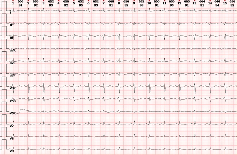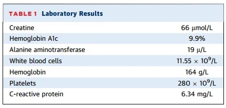 现病史:患者41岁男性,持续胸痛1天,周六晚被送入急诊,可平躺,肺部未闻及湿啰音,血压150/110mmHg。入院查心电图示广泛前壁导联的ST段压低,下壁导联Q波伴T波倒置(图1)。实验室检查结果:高敏肌钙蛋白0.161 ng/mL,CK-MB 8.94 ng/mL,NT-proBNP 779.20 pg/mL(其他检查结果见表1)。诊断为非ST段抬高型心肌梗死(Killip 分级 I 级),GRACE 风险评分110分。