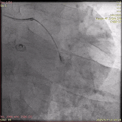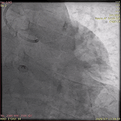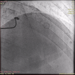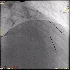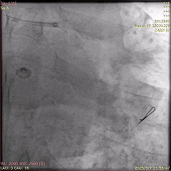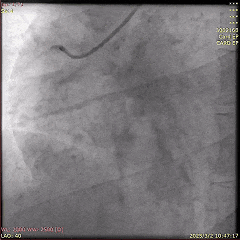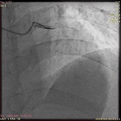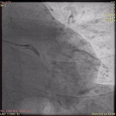 5天后,为患者进行第二次PCI,旨在处理LCx病变。冠脉造影显示,LCx中段模糊病变部位闭塞,术中于病变处植入药物洗脱支架,成功实现血管再通。