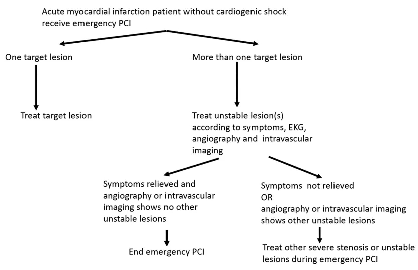 我们建议,应结合冠脉造影与血管内成像技术进行综合评估,以识别易损斑块,从而指导决策。最新的《2025年AHA/ACC/ACEP/NAEMSP/SCAI急性冠状动脉综合征患者管理指南》也建议血管内成像指导PCI。斑块负荷增加、正向重塑、薄纤维帽覆盖的大脂质核心、巨噬细胞积聚和新生血管都是易损斑块的特征。对于在初次干预中识别出的此类高风险病变,我们建议在同一台急诊PCI中考虑完全血运重建。下图为优化术中决策的流程图(图3),以供临床参考。
