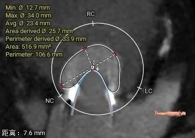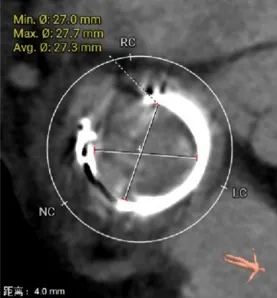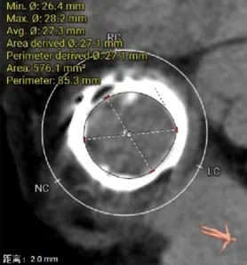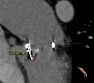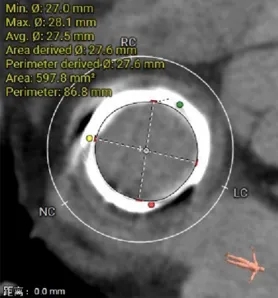 选瓣依据:该二尖瓣原置换生物瓣型号未知,CT测量生物瓣瓣环周长折算直径约27.6mm,瓣架高度约21.2mm。