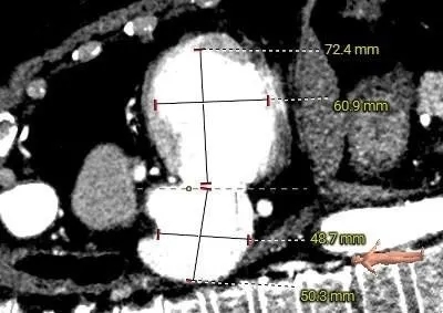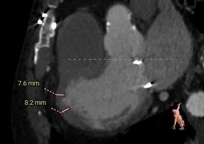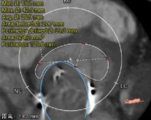 选瓣依据:该二尖瓣原置换生物瓣型号未知,CT测量生物瓣瓣环周长折算直径约25.0mm,瓣架高度约17mm。