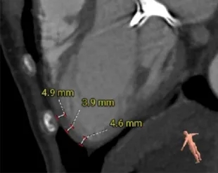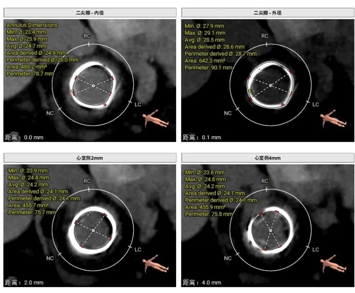 选瓣依据:该二尖瓣原置换生物瓣型号未知,CT测量生物瓣瓣环周长折算直径约25.0mm,瓣架高度约18mm。