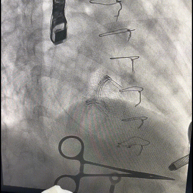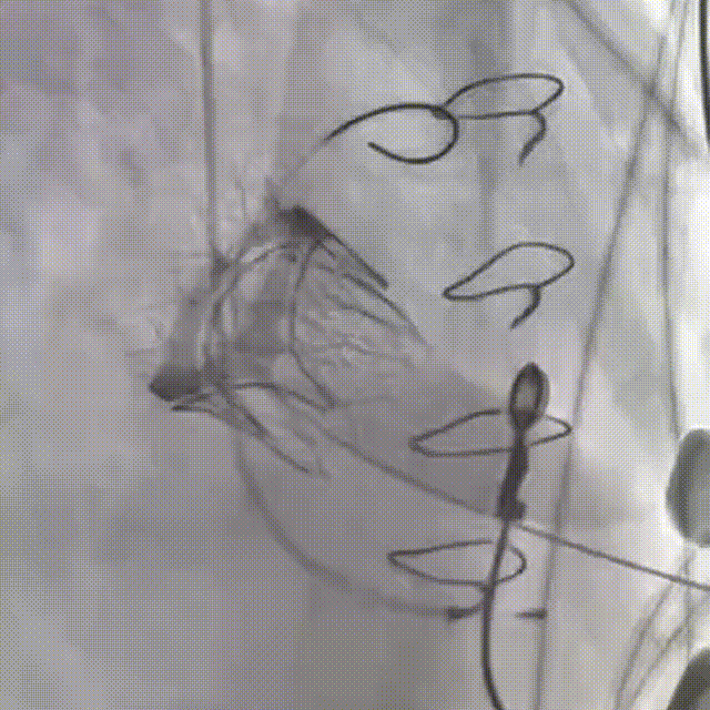 160bpm起搏下部分回收瓣膜后,调整同轴性,第二次释放瓣膜