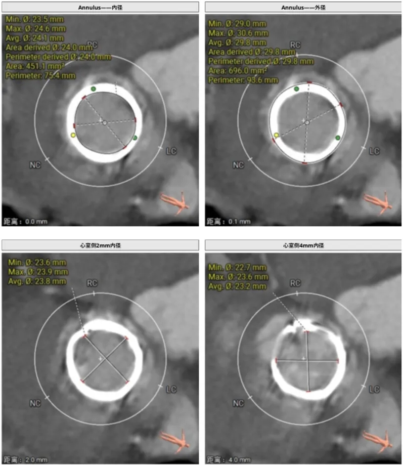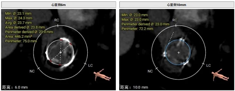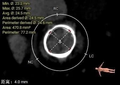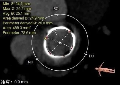 选瓣依据:该二尖瓣原置换生物瓣型号未知,CT测量生物瓣瓣环周长折算直径约24.0mm,瓣架高度约19.4mm。