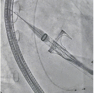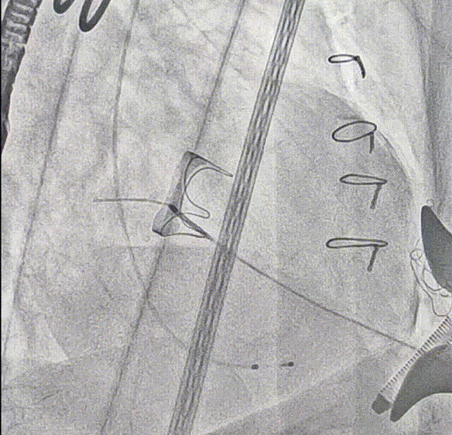 直头导丝配合鞘芯跨瓣,最终将加硬导丝盘置于左心房输送系统入心尖并跨瓣,同轴良好,调整瓣膜上1/4与瓣环平面平齐,瓣膜先预释放三分之一,后180bpm起博下完全释放瓣膜