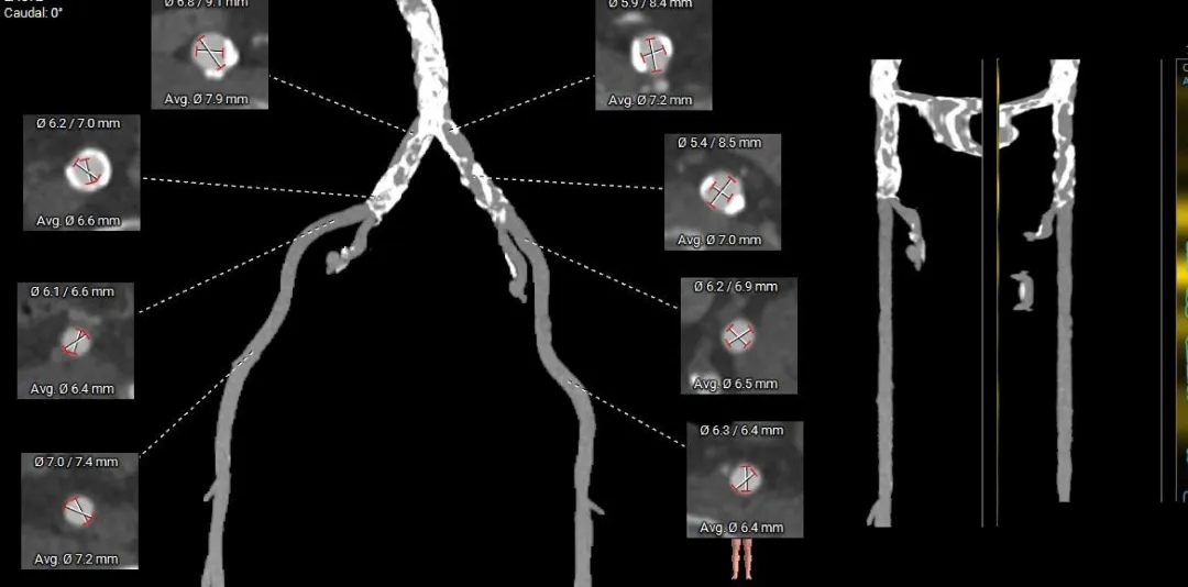 外周血管内径充足,双侧髂动脉及腹主动脉可见明显钙化,无明显迂曲;