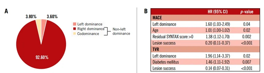 本研究共纳入4625例左主干PCI患者,166例(3.6%)为左主干优势型。这些患者高血压和既往PCI史的发生率较低,孤立性左主干病变的发生率较高,病变长度较短,参考血管直径较大,SYNTAX评分较低。多变量Cox回归分析显示,年龄、左主干优势型和血运重建不完全与主要不良心血管事件(MACE)风险增加相关,而病变血运重建成功则与风险降低相关。此外,左主干优势型和糖尿病与靶血管重建(TVR)风险增加相关,而病变血运重建成功则与风险降低相关。(FigureA,FigureB)
