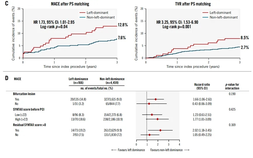倾向评分匹配后,左冠状动脉优势患者的3年主要不良心血管事件(MACE)发生率高于非左冠状动脉优势患者(调整后风险比[HR] 1.73;95%置信区间[CI]:1.01-2.95;p=0.04),这主要归因于靶血管重建(TVR)率较高(调整后HR 3.25;95% CI:1.53-6.90;p=0.001)。两组患者的全因死亡率、心脏死亡率和心肌梗死发生率相当。在校正非心脏死亡的竞争风险后,左冠状动脉优势组的MACE风险仍然高于非左冠状动脉优势组,但差异未达到统计学意义。根据 MACE 的亚组分析,左侧优势相关的较高风险在 LM 分叉病变患者和残余 SYNTAX 评分 > 0 的患者中更为显著。(FigureC,FigureD)