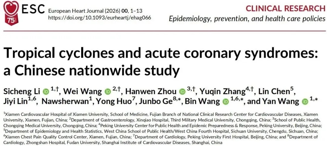Eur Heart J | 厦心医院王焱教授团队联合葛均波院士团队合作揭示台风和急性冠脉综合征的短期关联