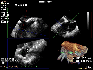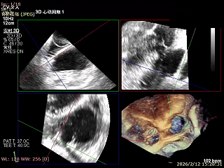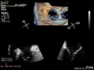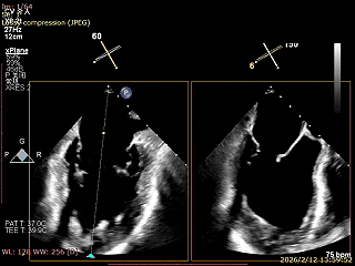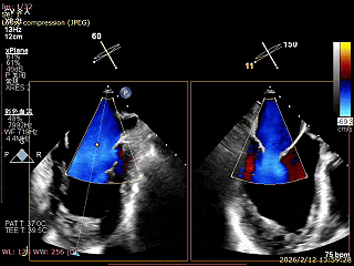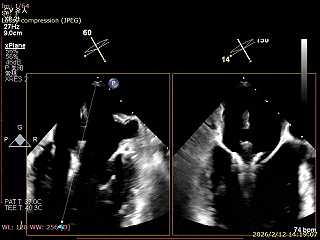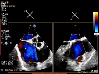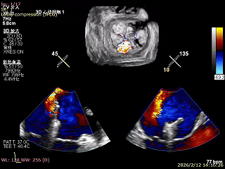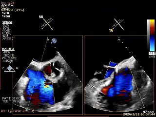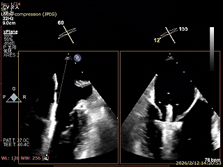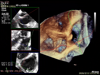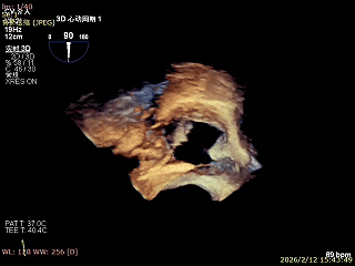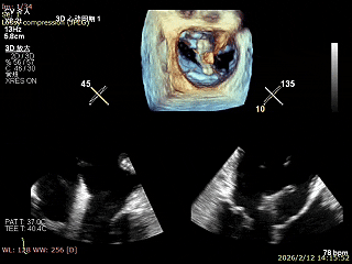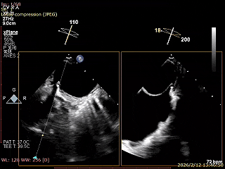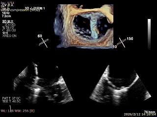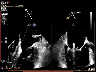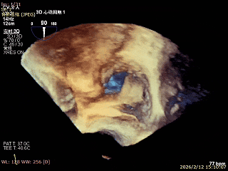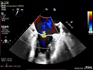 复查TTE及TEE检查进一步评估二尖瓣情况。明确为AFMR,二尖瓣功能性反流,2区瓣叶运动,重度FMR(3+),肺静脉逆向血流;2区后叶长度13 mm,2区前叶长度20mm,AP径37mm,瓣口面积4.08cm²,房间隔高度4.5cm,瓣叶无钙化,二尖瓣瓣膜条件适合行TEER手术。