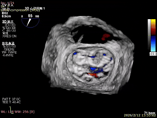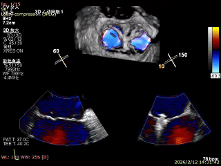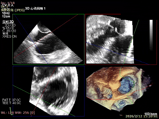 三尖瓣关闭不全重度(4+,平均缩流颈10mm),反流口以前隔、中央为主,部分后隔,瓣叶未见明显脱垂及GAP,三尖瓣环扩张(瓣环平均径43mm),二尖瓣中-重度反流,肺动脉高压(PASP:44mmHg)。