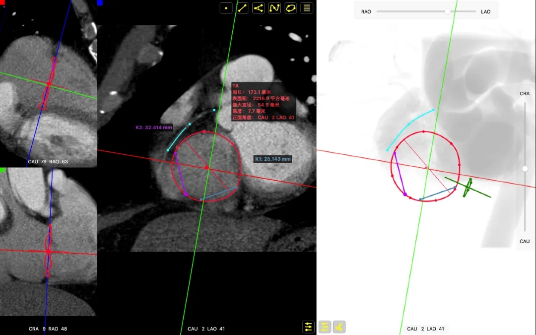 收缩期周长:173mm 面积2217mm²。非右冠优势型,RCA走行中段之后未见瓣环平面冠脉显影。术中冠脉影响风险较低。