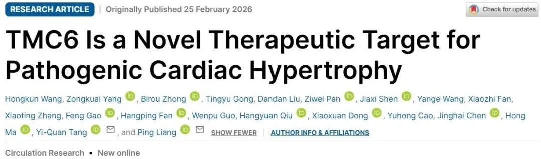 2026年2月25日,浙江大学转化医学研究院/医学院附属第一医院梁平教授团队联合复旦大学脑科学研究院唐逸泉教授团队在Circulation Research杂志在线发表题为“TMC6 is a novel therapeutic target for pathogenic cardiac hypertrophy”的研究论文,首次揭示TMC6是病理性心肌肥厚的内源性抑制因子,提示增强TMC6活性有望为该疾病提供新的治疗策略。