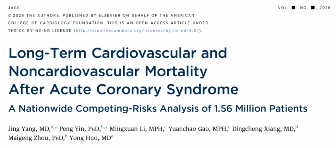 论文信息:Yang J, Yin P, Li M, et al. Long-Term Cardiovascular and Noncardiovascular Mortality After Acute Coronary Syndrome: A Nationwide Competing-Risks Analysis of 1.56 Million Patients.J Am Coll Cardiol. Published online February 6, 2026. doi:10.1016/j.jacc.2025.12.064