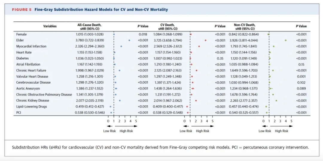 本研究结果具有重要临床指导意义:ACS患者出院后的死亡风险并非长期由心血管事件单一主导,而是呈现随时间演变的竞争风险格局。因此,ACS的长期管理不应仅聚焦于“防止再梗死”和“降低心血管死亡”,而应转向以患者整体死亡风险为中心的整合管理策略。尤其需重视恶性肿瘤和慢性肺部疾病等非心血管死因,在心血管专科管理基础上,加强肿瘤科、呼吸科等多学科协作。此外,在积极实施PCI和规范二级预防药物治疗的同时,系统识别并长期管理慢性肾脏病、糖尿病等关键共病,可能是进一步降低ACS患者远期死亡风险的重要路径。