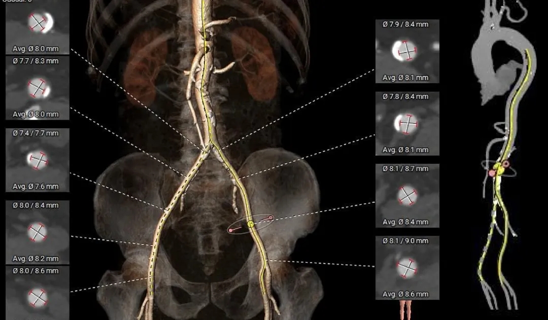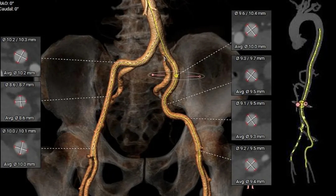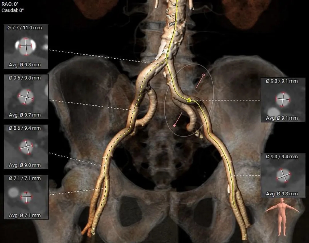 入路选择:右侧股动脉主入路,超硬导丝支撑下植入大鞘;