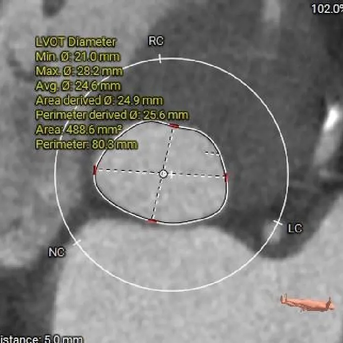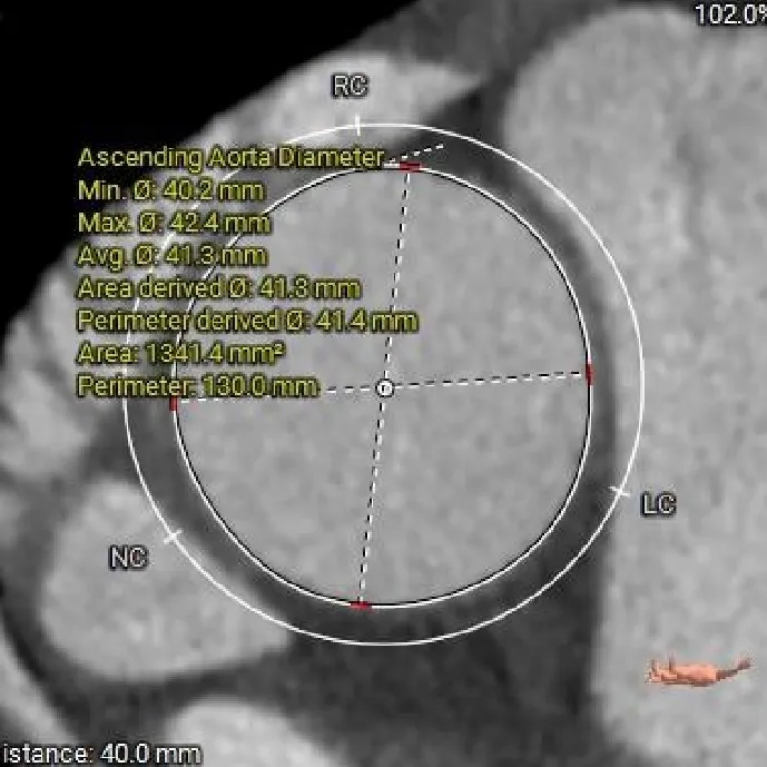 手术操作:该患者流出道直筒型,窦部空间较大无锚定力,需充分利用瓣环及瓣下空间参与锚定,瓣膜需瓣下附近释放,术中通过顶导丝等操作保证瓣膜同轴性,当瓣膜完全展开后,多角度评估其稳定性。