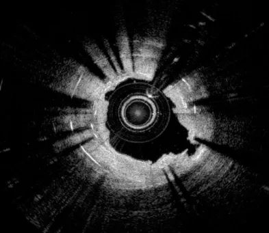图1:OCT横截面显示存在严重管腔狭窄,多个同心支架层,支架层之间可见非均质性增生。