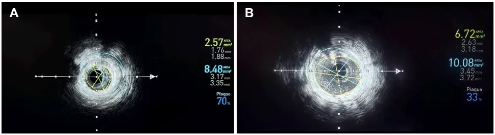 ➤ 术后IVUS证实显著改善:最小管腔直径[MLD]:2.6×3.1mm,最小管腔面积[MLA]:6.7mm2。