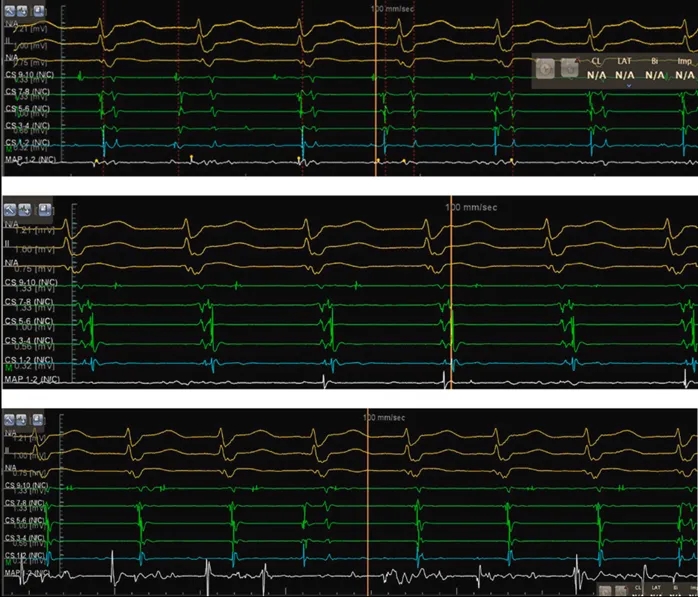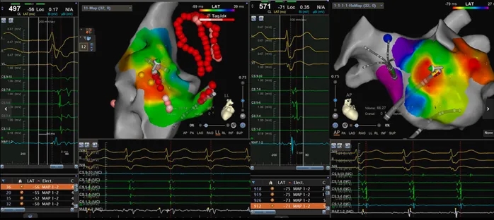 本例患者具有显著家族史,其激动顺序不稳定且高度多变,给鉴别诊断带来了极大挑战。需考虑的潜在心律失常类型包括房颤、房速、房室折返性心动过速及房室结折返性心动过速等,其主要机制很可能为多源性房速。心内电生理标测证实了其复杂性,导致完整激动顺序标测难以实现。传统标测技术如拖带、RS2刺激及希氏束旁起搏等作用有限。因此,更可行的策略是依次针对并消除单个心律失常形态,而非尝试对多源房速同时进行标测。