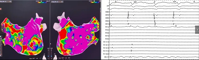 图注:(左图)左房电压图示前壁低电压区;(右图)双肺静脉可见瘢痕及延迟肺静脉电位