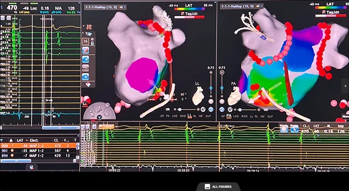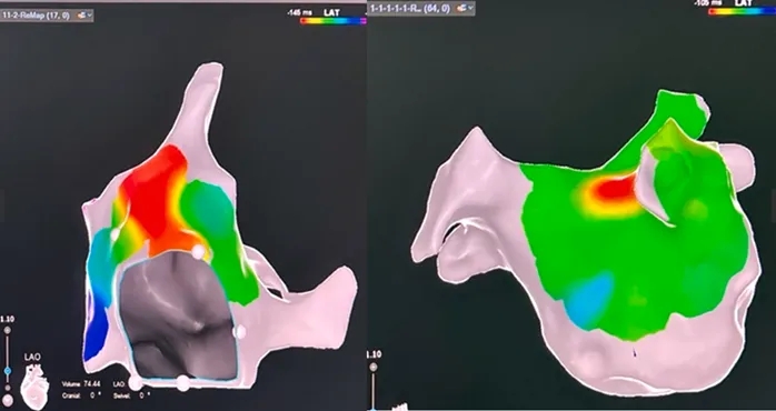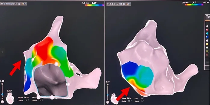随后,术者团队采用多电极标测导管,在心动过速短暂稳定发作期间进行标测,每次专注于一种形态。共识别出两种主要房性心动过速形态: