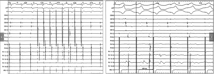 图注:红线标示A-A间期,蓝线标示V-V间期。图中PV导联代表位于右心耳内的标测电极