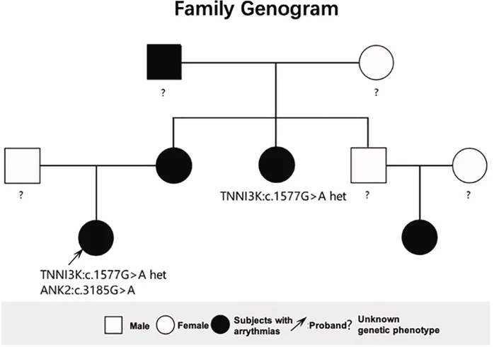 研究表明,房颤触发灶的胚胎学起源与其临床表型及遗传背景相关。起源于原始心房的触发灶可能与房颤的持续存在及消融反应不佳有关;而起源于静脉窦的触发灶则可能与遗传因素相关,且对消融反应良好。本例患者携带一个高度可疑的致病性突变——TNNI3K基因c.1577G>A,以及一个意义未明的变异——ANK2基因c.3185G>A。TNNI3K基因突变与常染色体显性遗传的心脏传导系统疾病相关,可伴或不伴扩张型心肌病(临床可表现为房颤、室性早搏等)。本例患者多数触发灶起源于静脉窦区域(如界嵴下部、冠状静脉窦远端),消融效果显著。