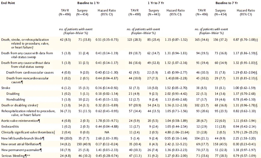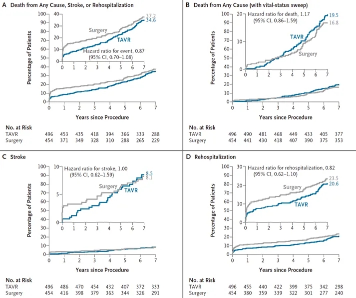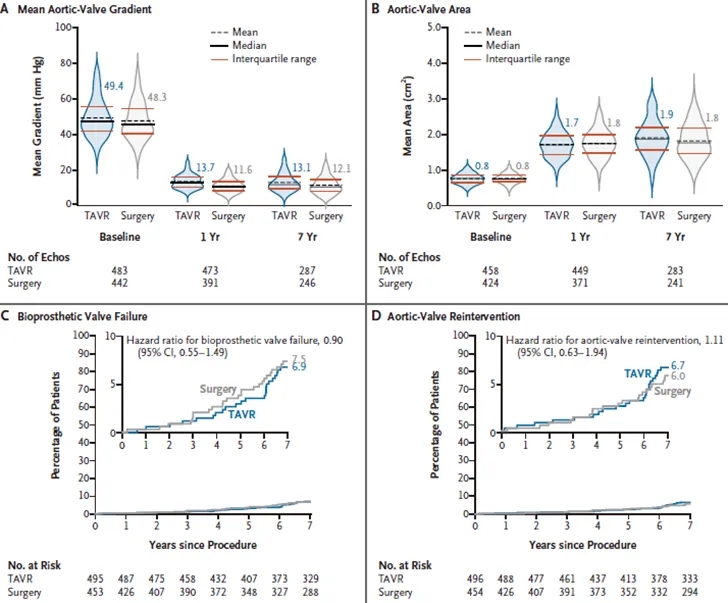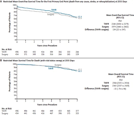 在低危的严重症状性主动脉瓣狭窄患者中,接受TAVR与接受外科手术的患者在7年时涉及死亡、卒中和再住院的两个主要复合终点方面未观察到显著差异。