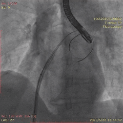 在经股静脉途径的TEER手术时,房间隔穿刺是一个很重要的基础步骤。有时候房间隔组织较韧较厚(多见于房间隔短穿刺位置需要靠后,或者外科房间隔修补术后),穿刺针通过之后要通过导引大鞘(GC)存在着较大困难,若强行推送大鞘可引起房间隔撕裂到左心房顶引起灾难性心包填塞。传统做法时使用外周球囊对房间隔进行扩张,但是不是每个导管室都常规配备外周球囊,且使用过大球囊仍可引起房间隔撕裂风险。我们提供了一种更简洁的方式,即使用导引鞘内芯和房间隔穿刺鞘两个管子(双管齐下)同时扩张房间隔穿刺口,再推送导引大鞘通过房间隔,无需额外器械,操作简单高效且安全(图1-4)。