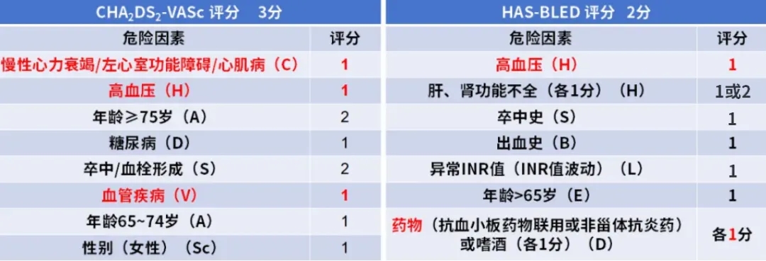 CHA2DS2-VASc评分3分,HAS-BLED评分2分。
