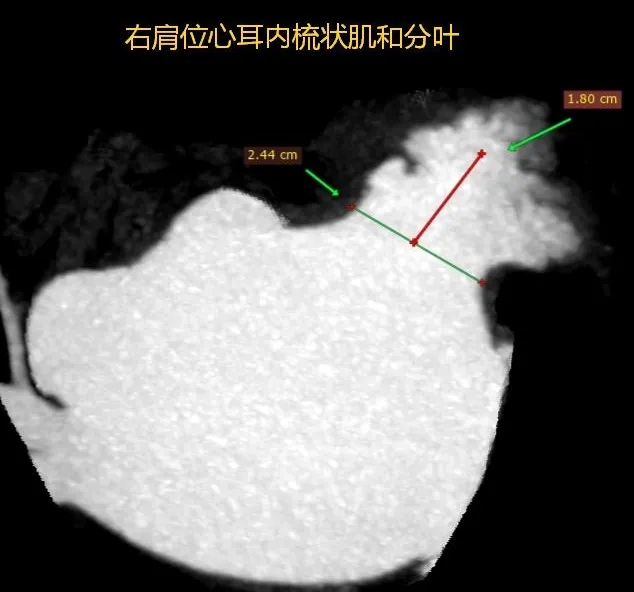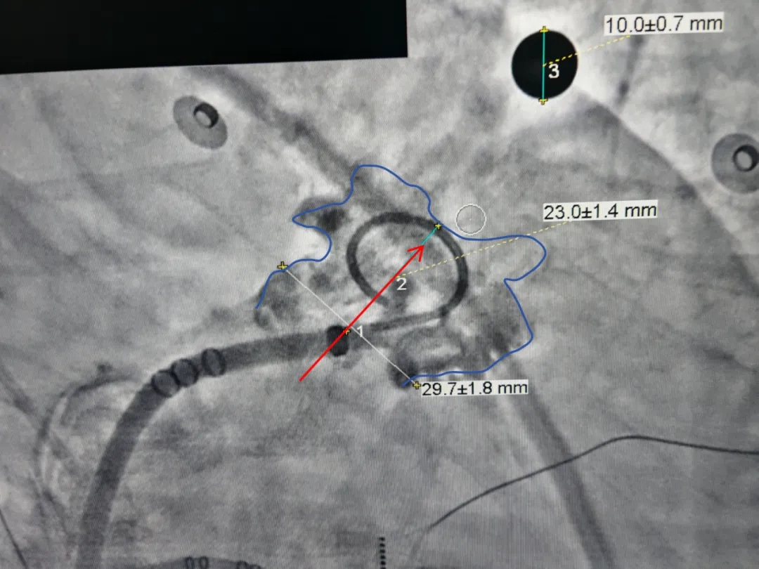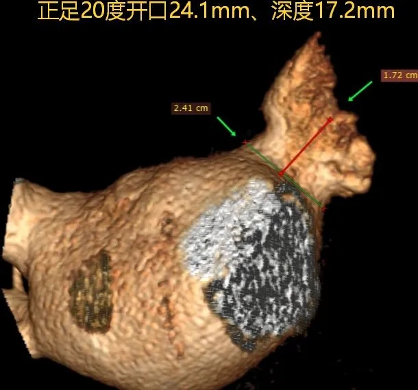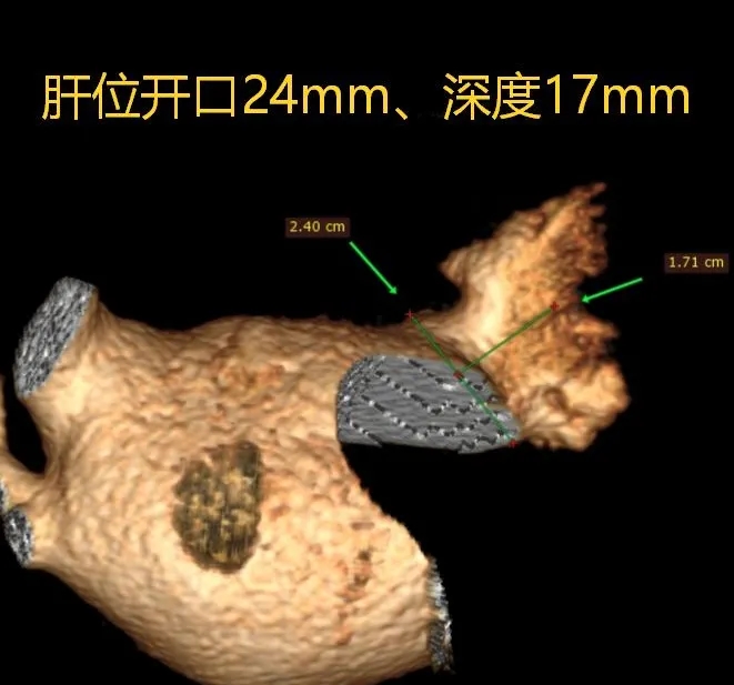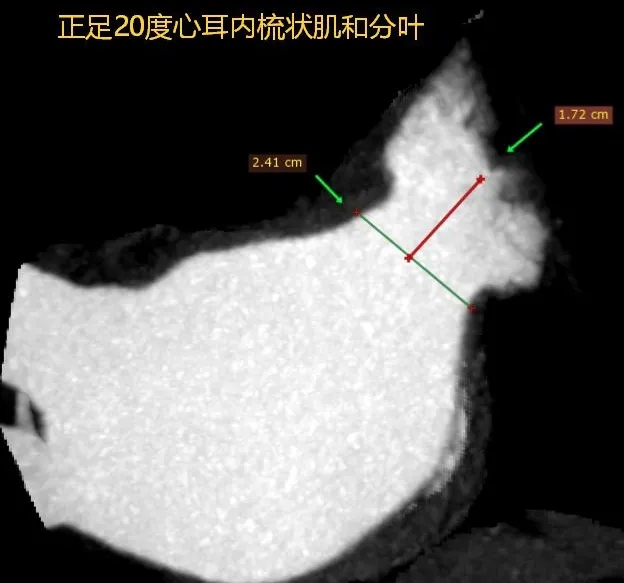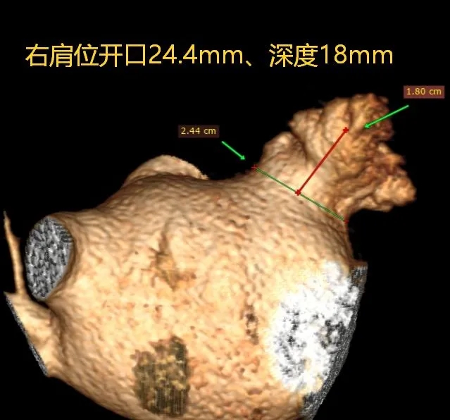 本病例中患者心耳属于大开口菜花型,心耳开口29.7mm,深度23mm,远端分叶及梳状肌较发达,对封堵器稳定性有一定要求。