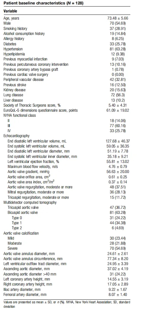 本研究为前瞻性、多中心、单臂临床试验(NCT05202977),共纳入128例有症状的重度AS患者,平均年龄73.48±5.66岁,平均胸外科医师协会(STS)评分5.40±4.31%,均为中高危或不适合外科手术的患者。值得关注的是,入组人群中63.28%为BAV患者,54.69%存在瓣膜重度钙化,76.56%为中-重度钙化,该人群特征高度贴合中国AS患者BAV比例高、钙化程度重的解剖特点,且包含23.44%STS评分<4%但术后30天死亡或不可逆并发症风险>50%的高风险患者,本次入组病例极具临床挑战性。